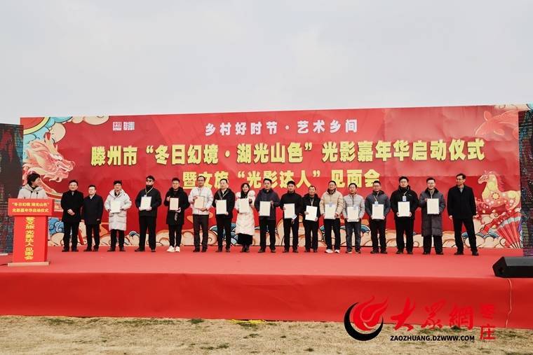 r受表扬的文旅宣推达人代表登台分享创作心得,讲述自己用镜头捕捉乡土烟火、定格善城美景、传播家乡魅力的点滴历程,言辞恳切、情感真挚,既展现了对滕州的深厚热爱,也表达了持续为家乡文旅代言的热情与坚定决心。在众人的共同期待中,与会领导与“文旅光影达人”代表共同启动了光影嘉年华,标志着这场新春文旅盛宴正式启幕,为滕州春节文旅市场注入强劲活力。